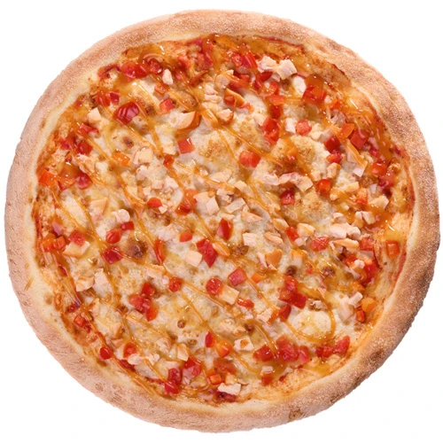 Цыпленок копченый, томаты, болгарский перец, сыр Моцарелла, кисло-сладкий соус, томатный соус. Внешний вид может отличаться в зависимости от размера.